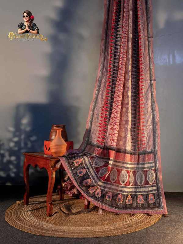 Drape yourself in timeless grace with this exquisite soft Chanderi saree, beautifully enhanced with intricate Kantha stitch highlights. The saree showcases a rich blend of earthy tones—muted mauve and dusty rose as the base, gracefully contrasted with deep maroon, charcoal black, and subtle gold accents. The pallu features striking zigzag Kantha patterns in red and black, while the border is adorned with delicate woven motifs and floral-inspired highlights, adding a touch of artisanal charm.