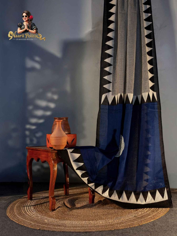 The saree features intricate handblock prints, a signature art form of Jaipur, showcasing skilled craftsmanship in every detail. The body is adorned with subtle geometric patterns in earthy beige tones, while the bold triangular border in classic black adds a striking contrast. The rich deep blue pallu enhances the overall look, lending a graceful and contemporary touch to this traditional weave.