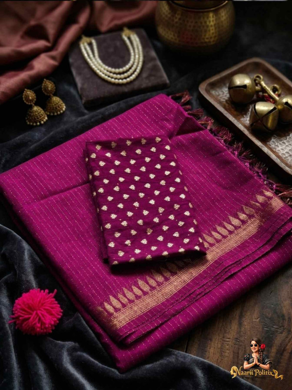 The body of the saree showcases fine, subtle woven lines that lend it a refined and sophisticated appeal. Paired with a matching blouse piece, this ensemble strikes the perfect balance between classic charm and contemporary style.