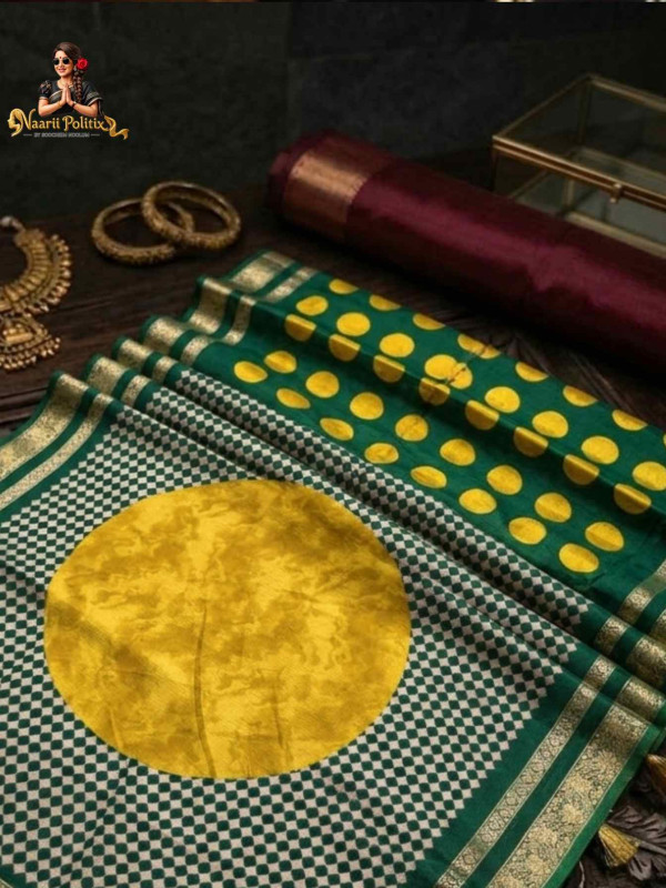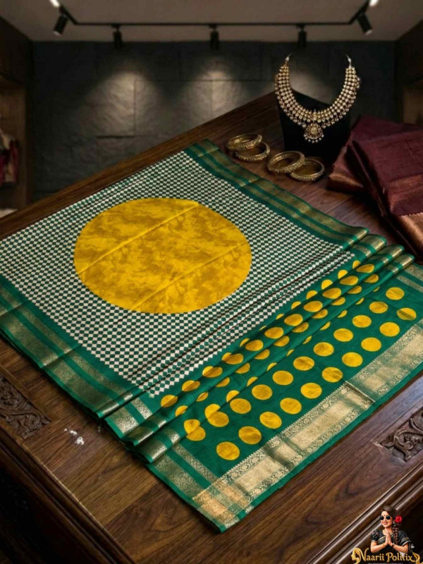 Elevate your ethnic wardrobe with this stunning Marble Saree, a perfect blend of tradition and contemporary elegance. Crafted with finesse, this saree features a rich emerald green base adorned with bold mustard yellow polka (butta) motifs, creating a vibrant and eye-catching contrast.