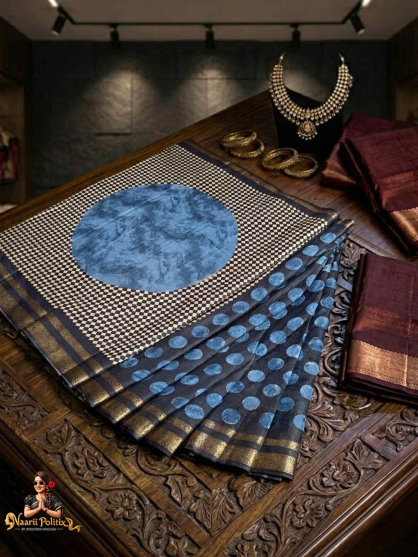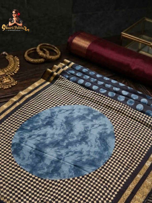 Elevate your ethnic wardrobe with this stunning Marble Saree, a perfect blend of contemporary design and traditional charm. Crafted with artistic precision, this saree features a unique marble-inspired circular motif in rich indigo tones set against a classic black and ivory checkered base, creating a bold yet graceful look.