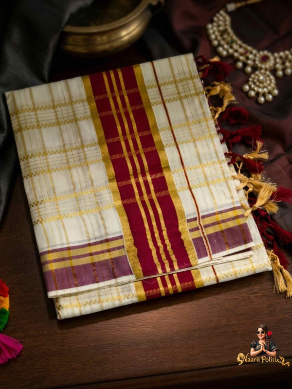 Gracefully rooted in Kerala heritage, this elegant Kasavu saree blends timeless tradition with subtle contemporary charm. Crafted in breathable pure cotton, the saree features a delicate checked weave across a soft off-white base, beautifully complemented by a rich deep maroon (araku) and gold zari kara. The classic border is accentuated with fine golden lines and a bold central stripe, adding depth and festive richness to the drape.