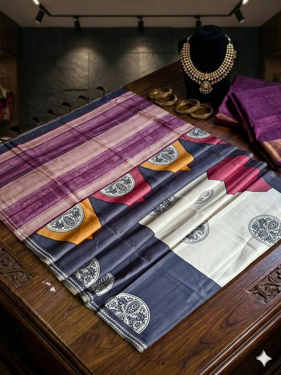 Elevate your ethnic wardrobe with this exquisite Tusser Silk Saree, a perfect blend of subtle elegance and artistic detailing. The saree features a graceful interplay of muted mauve, deep charcoal grey, soft beige, and rich maroon tones, beautifully layered in a striped pattern across the body. The highlight lies in its contemporary pallu design, adorned with bold geometric blocks in mustard, ivory, and rose hues, accentuated by intricate traditional circular motifs that add a touch of heritage charm.