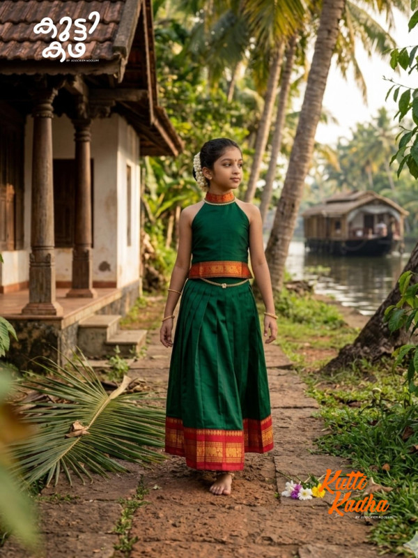 The rich emerald green Narayanpet weave, highlighted with intricate zari borders in warm tones, gives this set a regal and heritage-inspired appeal. The halter-style top features a finely detailed neckline and is paired with a gracefully flared skirt that moves effortlessly with every step. A beautiful bow detail at the back adds a delightful touch of sophistication and playfulness.