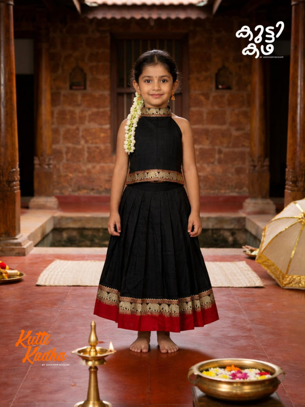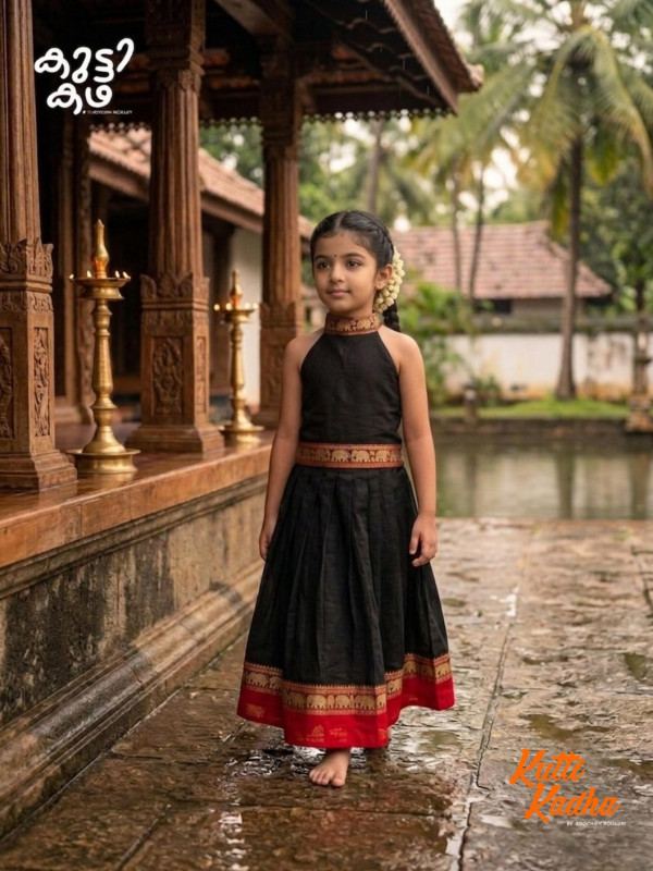 The rich black silhouette is accentuated with classic Narayanpet-inspired borders, adding a touch of heritage charm. The sleeveless top features a refined neckline and is paired with a gracefully flared skirt that allows ease of movement. A delicate bow detail enhances the overall look, giving it a playful yet sophisticated finish your child will love.