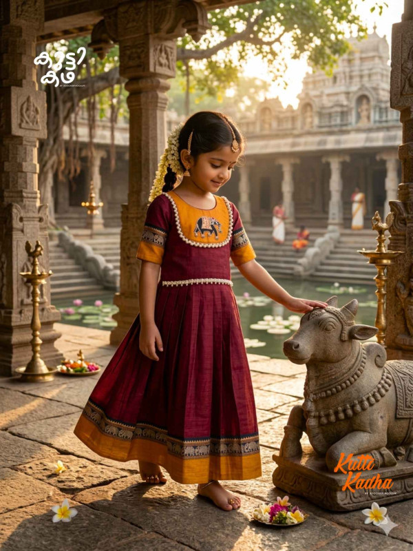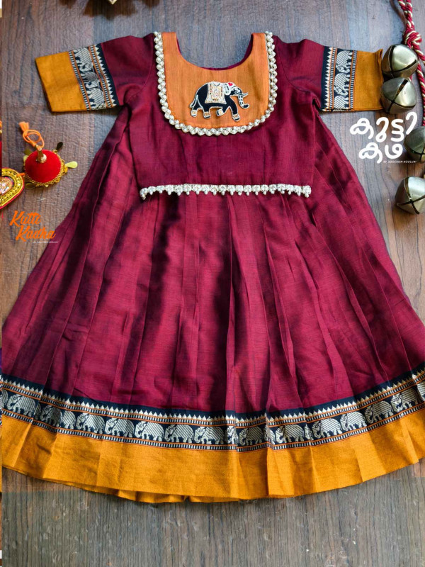 The rich maroon and mustard palette is inspired by classic Narayanpet weaves, enhanced with a delicate zari embroidery elephant patch on the top that adds a charming, heritage touch. The skirt features graceful pleats and a traditional woven border, creating a festive silhouette perfect for celebrations, functions, and special occasions.
