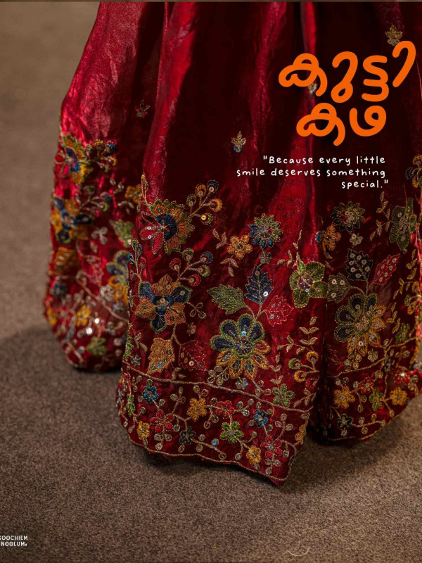 The stunning deep red skirt is adorned with intricate multi-color floral embroidery, beautifully enhanced with delicate sequin highlights that add a subtle shimmer to every movement. Paired with a sleek, stylish black top, the outfit creates a perfect balance of tradition and modern sophistication.