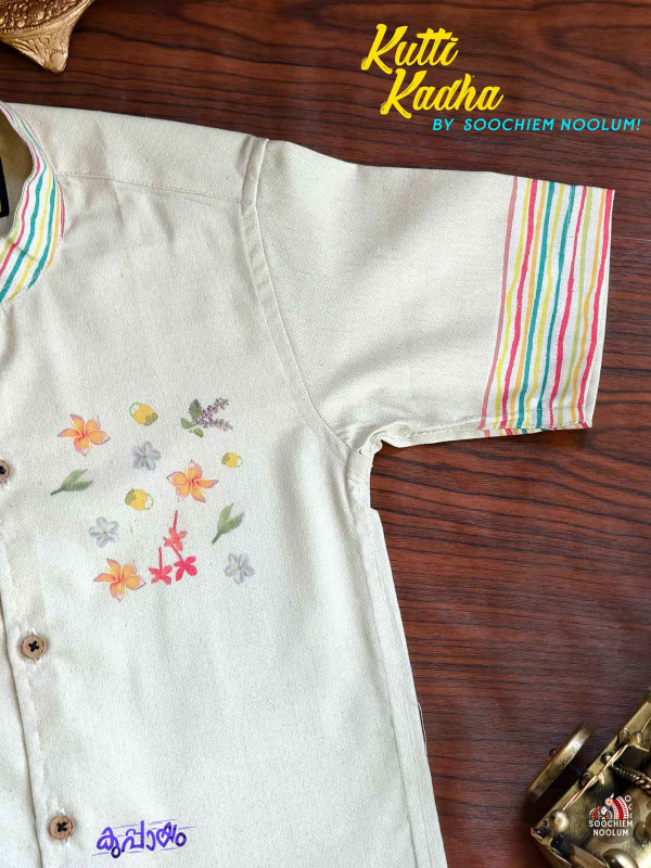 Step into a slice of childhood with OLAKKILI, a designer shirt from our nostalgic BALAN series. Part of the Kutti Kadha collection, this piece is a celebration of playful memories – of crafting parrot toys from coconut leaves, plucking fresh chethi, mandaram, and thulasi from our backyard garden, and chasing sun-drenched afternoons.