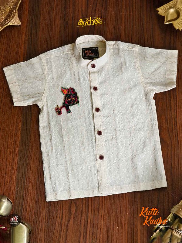 At the heart of the design is a beautifully embroidered Sree Krishna patch, bringing a divine charm and cultural essence that’s perfect for traditional gatherings, festivals, and photo moments.